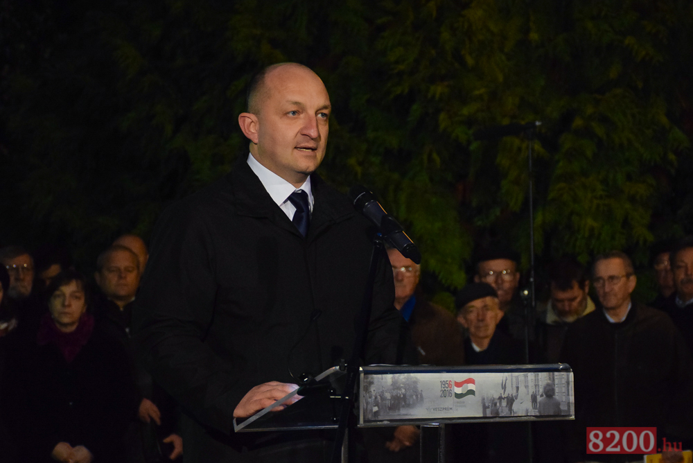 Takács Szabolcs Veszprém megyei kormánymegbízott ünnepi beszédében rámutatott, hatvan esztendeje annak az ősznek, amikor az egész világ Magyarországra figyelt. Mindenki megtanulhatta, a magyar szabadság szerető nép, képes az élete árán is harcolni, ha önállósága és nemzeti függetlensége a tét.