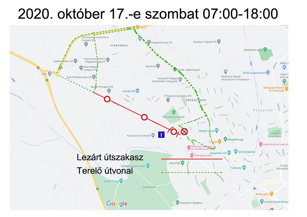 A lezárt útszakasz kezdete a Pápai út –Lázár utcai csomópontja, vége a Pápai út - Henger utcai csomópont. Az érintett útszakaszra történő behajtás tilos. A terelő útvonal a városközpont irányából az Eszterházy utca- – Szent István utca - Dózsa tér – Kistó utca- Házgyári út - 830 sz. országos közút, a 8-as számú főút irányából a Henger utca - 830 sz. országos közút – Házgyári út – Kistó utca – Dózsa tér – Táncsics utca – Lázár utca útvonal. A korlátozás alatt a Lázár utcában megállási tilalom van érvényben. A Veszprémvölgyi utca irányából a városközpont csak az Eszterházy utca irányába lehetséges, a Próder Ferenc utca zsákutcává válik.