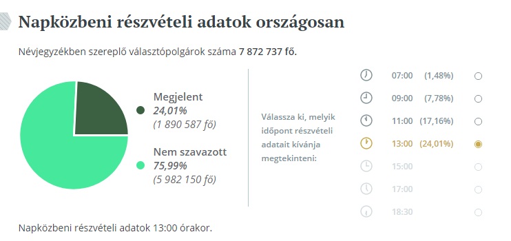 Az Európai Parlament (EP) magyar tagjainak választásán vasárnap 13 óráig a szavazásra jogosultak 24,01 százaléka adta le szavazatát a magyarországi szavazókörökben a Nemzeti Választási Iroda (NVI) adatai szerint.