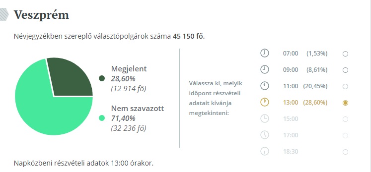 Veszprémben a névjegyzékben szereplő választópolgárok száma 45 150 fő, ebből 13 óráig 12 914 jelent meg a szavazó helyiségekben, ami 28,6 százalékot jelent. A legtöbben a 14-es körzetben mentek el szavazni a Botev iskolában, itt a szavazásra jogosultak 39,04 százaléka voksolt. Ugyanekkor a csererdeiek voltak a legkevésbé aktívak, a 28-as körzetben 20,11 százalék a részvételi arány.