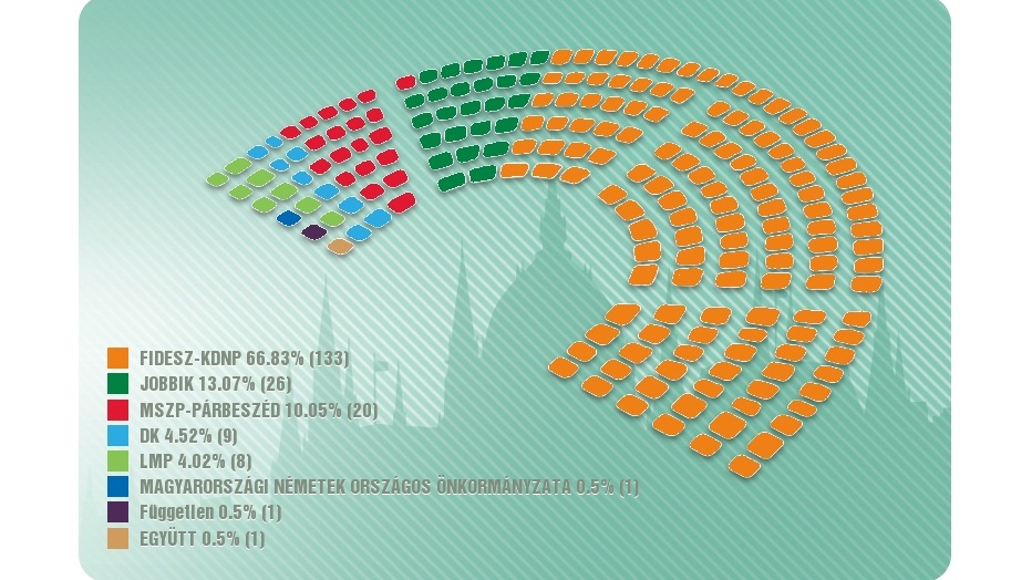 Az új Országgyűlésben így a Fidesz-KDNP-nek összesen 133, a Jobbiknak 26, az MSZP-Párbeszédnek 20, a DK-nak 9, az LMP-nek 8, az Együttnek és a német önkormányzatnak 1-1 képviselője lesz, és 1 független jelölt is bejutott.