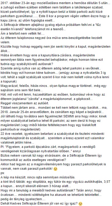 Mint írta: "az étterem tulajdonosa negyed óra múlva sms-beszélgetéstbe kezdett velem. Közölte hogy holnap reggelig nem jön senki kinyitni a kaput, magánterületen állok... Hiába érveltem hogy erre a kapunyitásra-zárásra, magánterületre semmilyen tábla nem figyelmeztet behajtáskor, mégis honnan kéne ezt tudnia egy szabálykövető autósnak?" Erre a kérdésre elég sok választ kapott a Parasztparkoló Veszprém oldalán, de a hozzászólók közül egy sem vette a védelmébe.