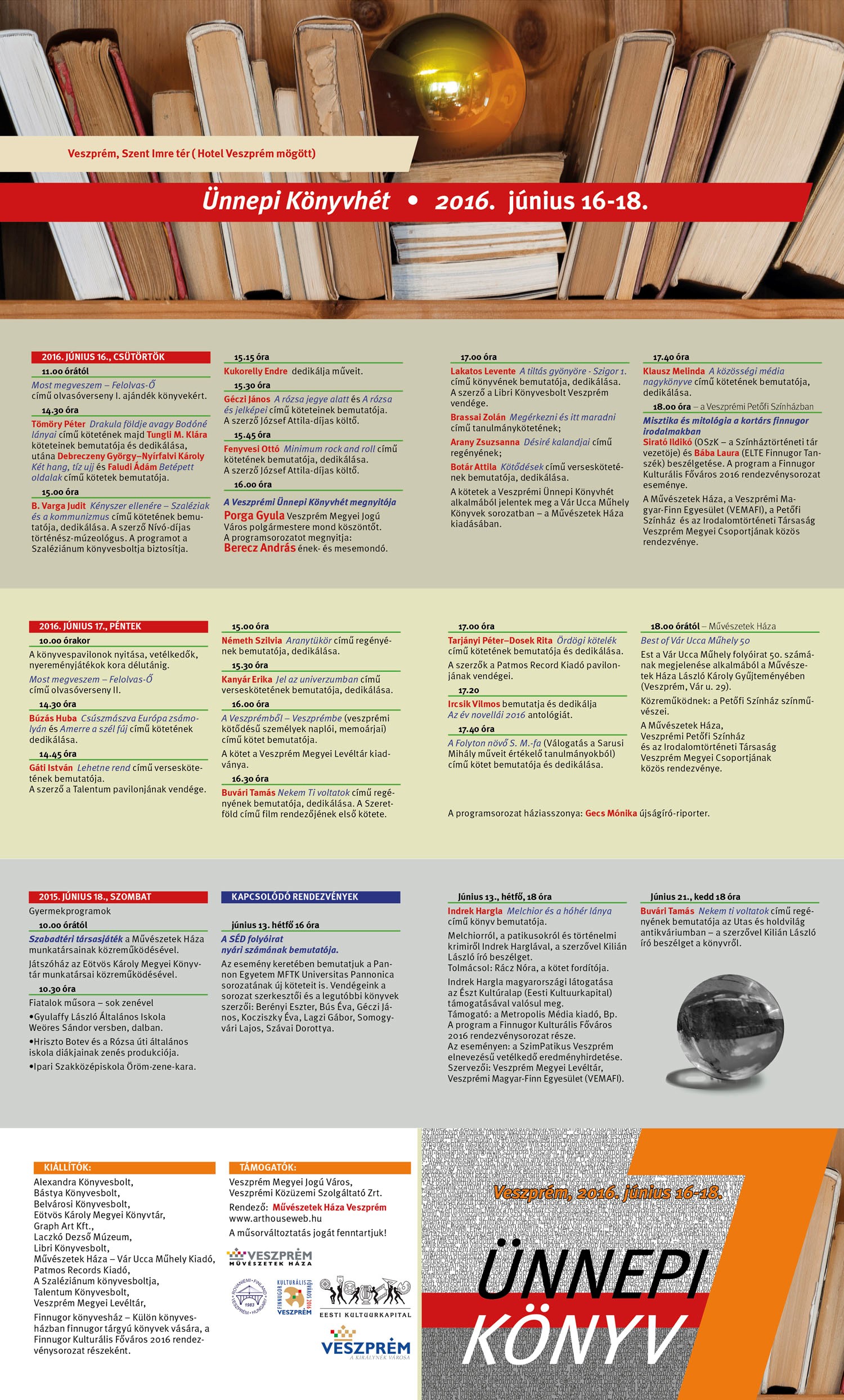 A labdarúgó Európa-bajnokság árnyékában nincsenek könnyű helyzetben a szervezők - jelentette ki köszöntőjében a csütörtöki megnyitó alkalmával Porga Gyula polgármester, hozzátéve, megtalálta helyét az esemény a Szent Imre téren. “Fontos, hogy az élő irodalommal is találkozhatnak a veszprémiek, hiszen rangos írók, költők érkeznek az eseményre” - fogalmazott.