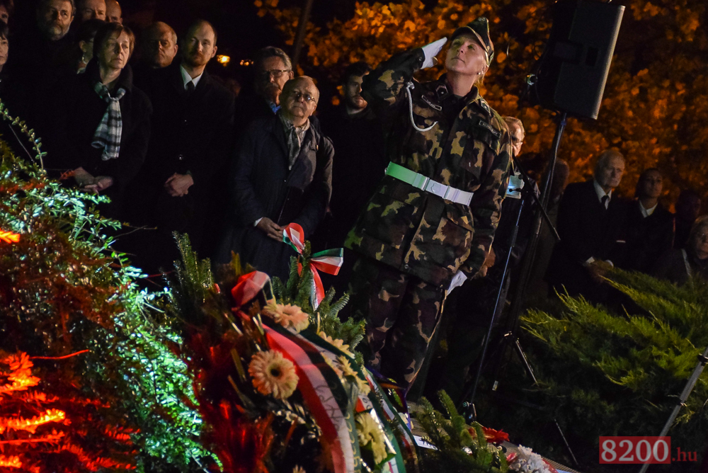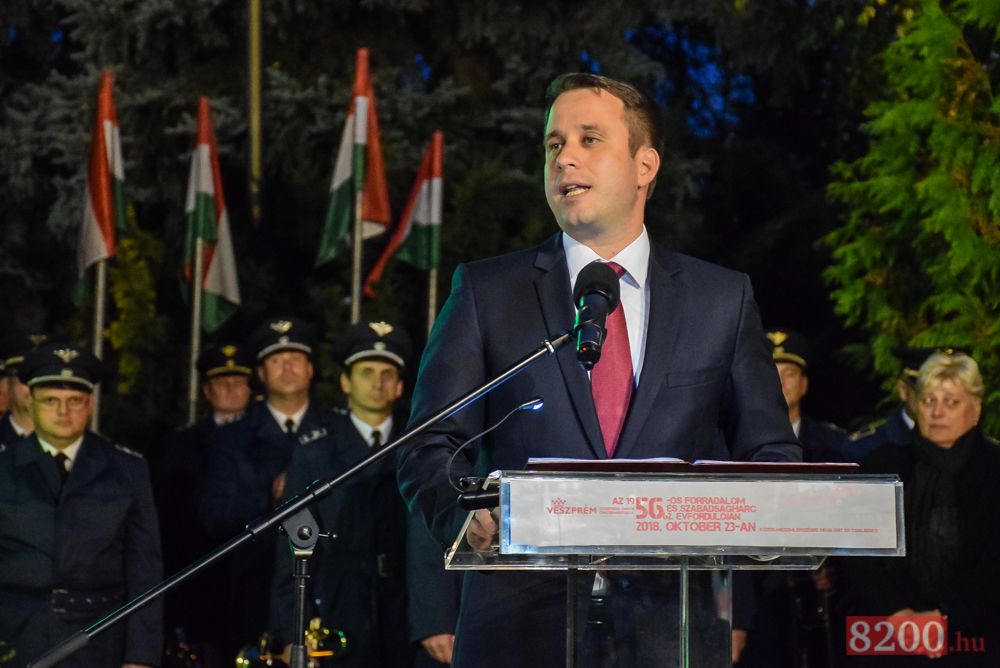 Az ünnepi beszédet Dömötör Csaba, a Miniszterelnöki Kabinetiroda parlamenti államtitkára mondta el. – Ott állt egy ember a bitófa árnyékában és az utolsó szó jogán megszólalt, a forradalmat egy olyan kocsihoz hasonlította, amit mások elindítottak, megvadították a kocsist és a lovakat, majd leugráltak róla, őt pedig azért hívták, hogy fogja meg a gyeplőt – idézte a veszprémi szabadságharcost, Brusznyai Árpádot. – Megtehette volna, hogy a történelem elől csendes menedékbe húzódik, de ő a pesti srácokhoz hasonlóan a nehezebb utat választotta – emlékeztetett.