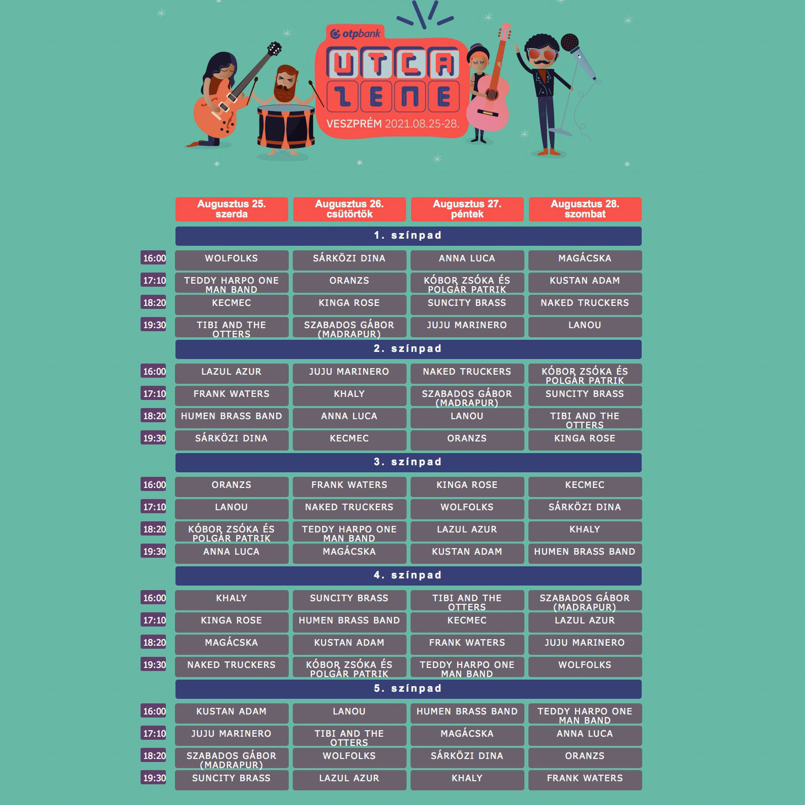 Napközben az alábbi 20 formáció verseng a közönség és a zsűri kegyein keresztül a 2.000.000 Ft összdíjazásért az Utcazene Fesztiválon agusztus 25-28.
