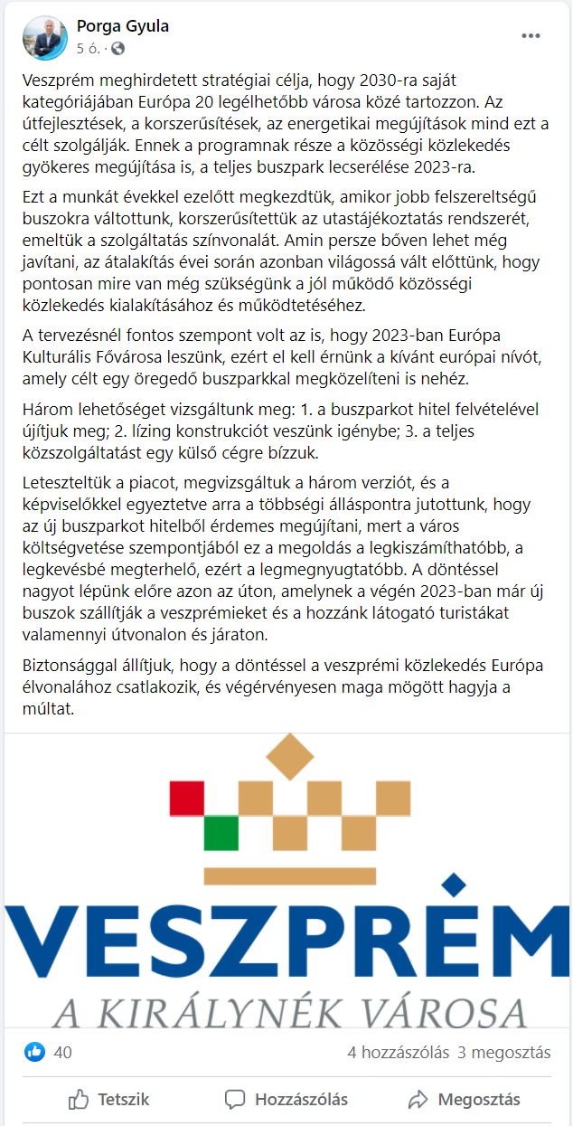 Ezt Porga Gyula polgármester írta közösségi oldalán.