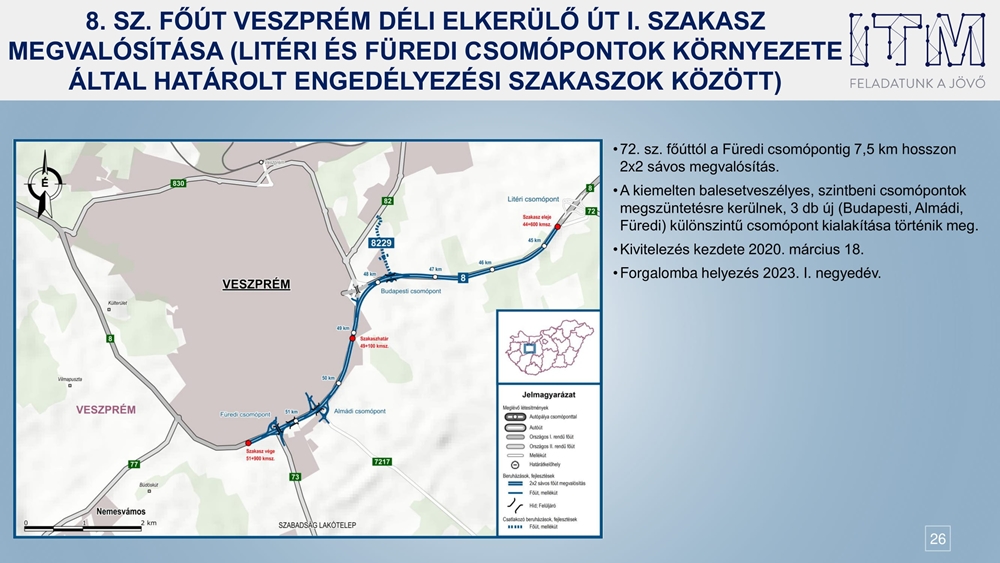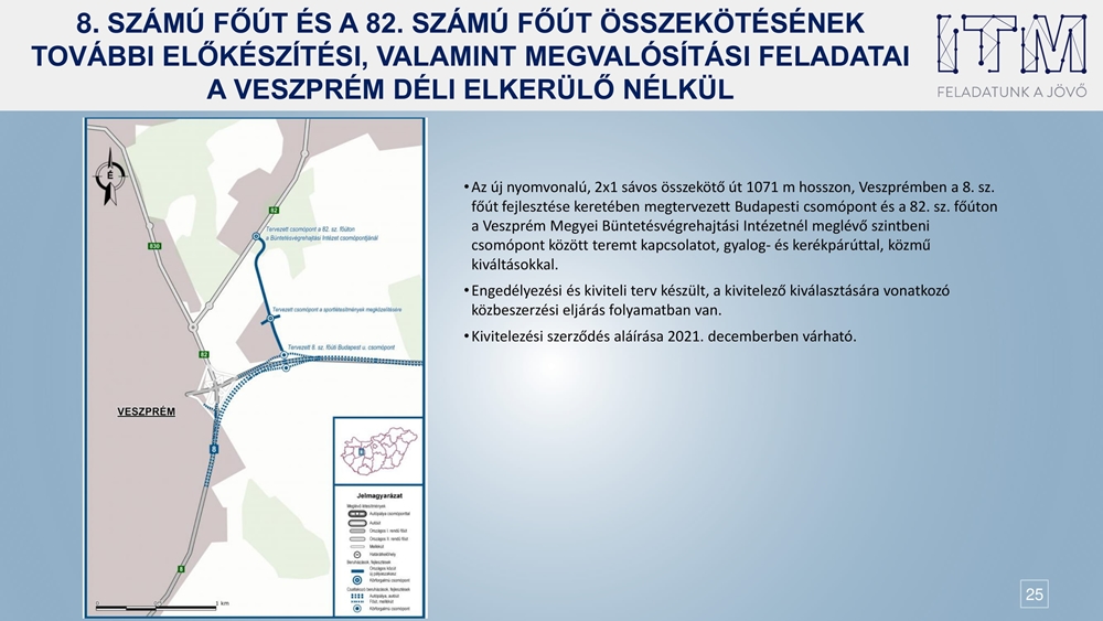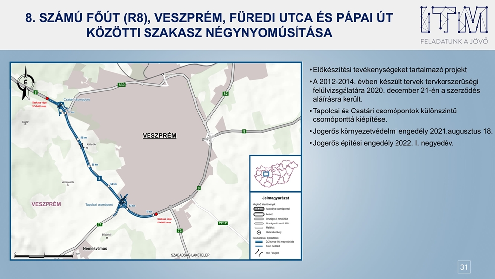 - Veszprém déli elkerülő 2x2 sávosítása a balatonfüredi többszintű csomóponttól a csatári többszintű elágazásig, többszintű kereszteződéssel a tapolcai elágazóban (építési engedély 2022-ben várható);