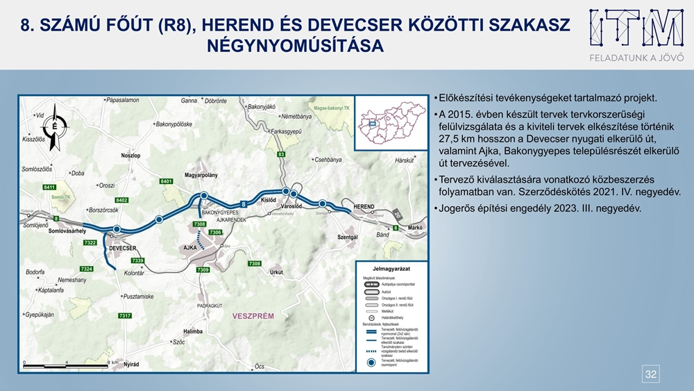 Herend-Devecser közötti útszakasz 2x2 sávossá tétele (építési engedély 2023-ban várható).