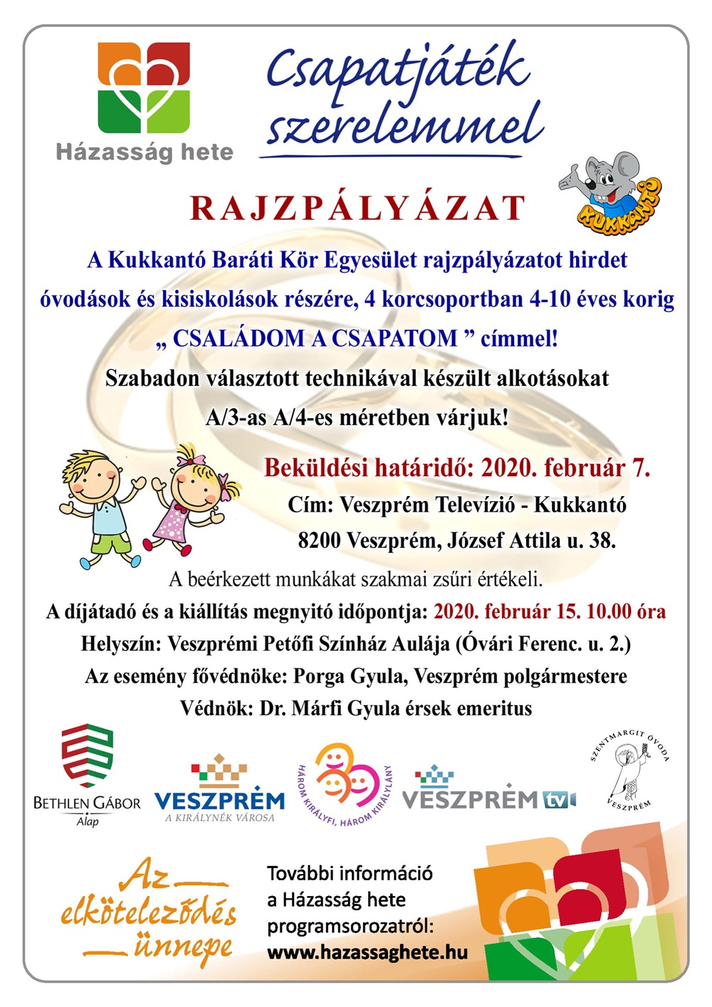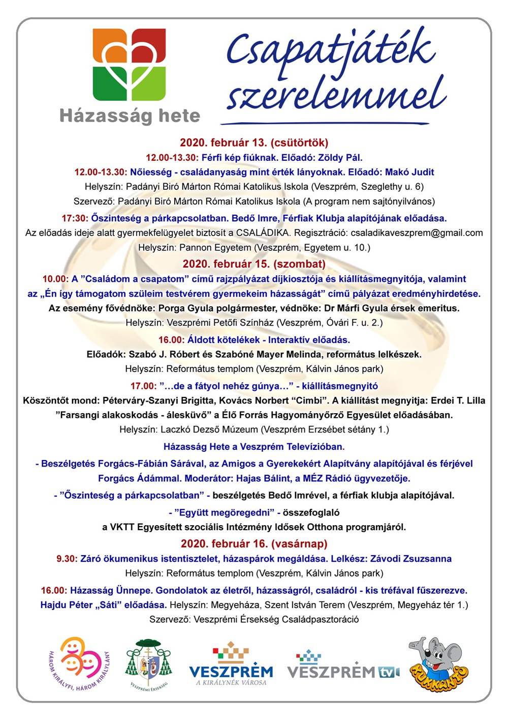 Itt is interaktív előadások, beszélgetések hirdetik a házasság, a család jelentőségét. A rendezvénysorozat keretében új kiállítást nyit a Laczkó Dezső Múzeum, meghallgathatják az érdeklődők Bedő Imre, a Férfiak Klubja alapítójának előadását, de lesz vitaest is a házasságról - tudósított a Veszprém Tv.