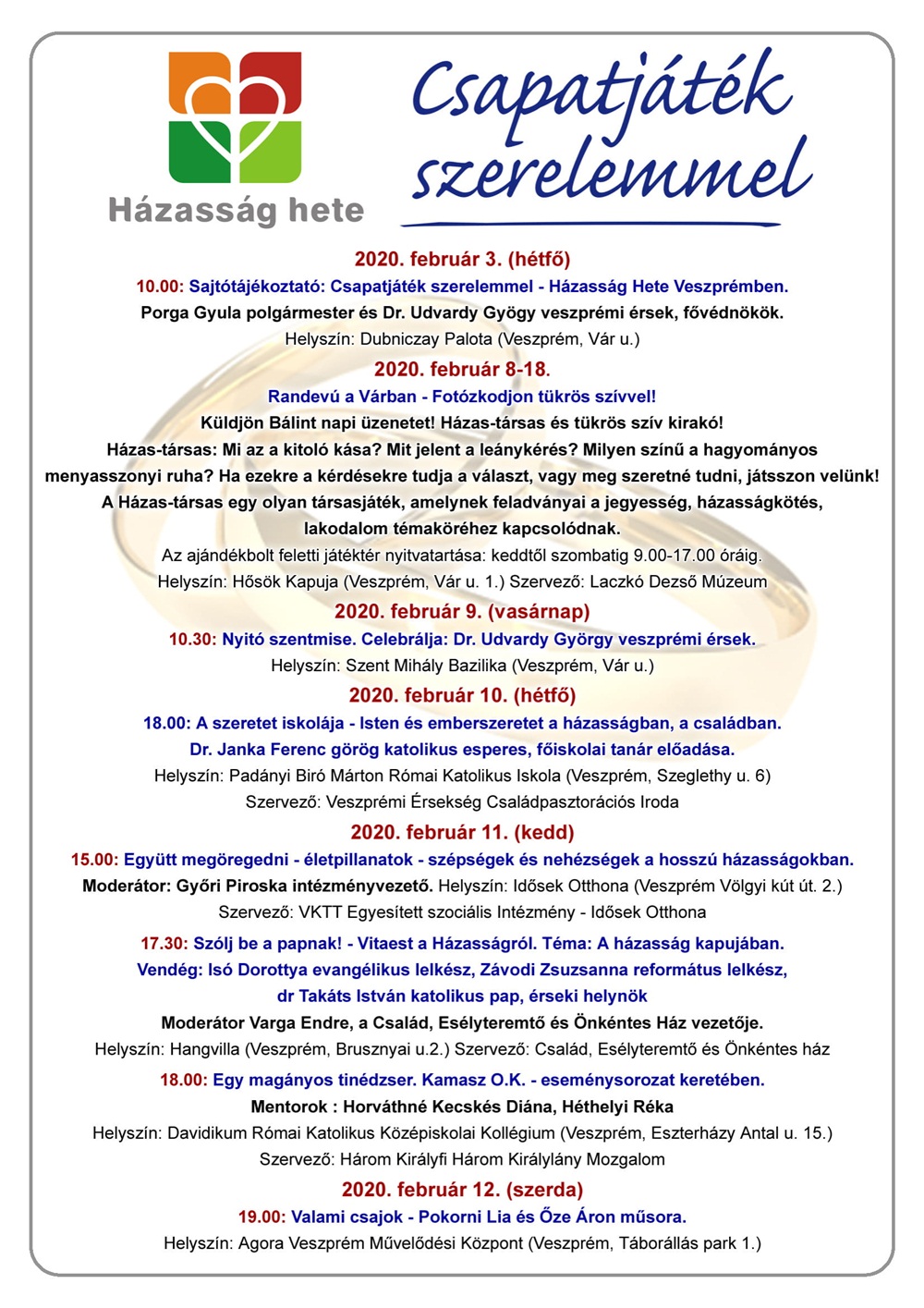 Február 9. és 16. között országszerte számos beszélgetés, előadás, kiállítás és egyéb kulturális és egyházi program hívja fel a figyelmet az elköteleződés fontosságára. Veszprémben hetedik alkalommal rendezik meg a programsorozatot.