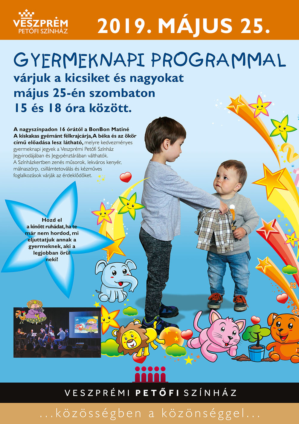Kiemelten fontosak számunkra az ifjú nézőink, ezért is teszünk meg mindent annak érdekében, hogy az ünnepük, a gyermeknap számukra felejthetetlen legyen. Zenés, szórakoztató műsorral, vetélkedőkkel, arcfestéssel, színházi előadással és sok-sok meglepetéssel várjuk Őket – jegyezte meg Kellerné Egresi Zsuzsanna igazgatóhelyettes. Hozzátette, minden évben kiegészítik az eseményt egy jótékonysági akcióval, idén a ruhagyűjtéssel szeretnék elindítani a legfiatalabbakat az érzékenyítés útján.
