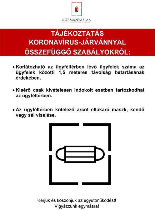 A koronavírus-járvány terjedésének megakadályozása érdekében a kormányhivatalok ügyfélszolgálatain óvintézkedések betartásával történik az ügyfélfogadás.