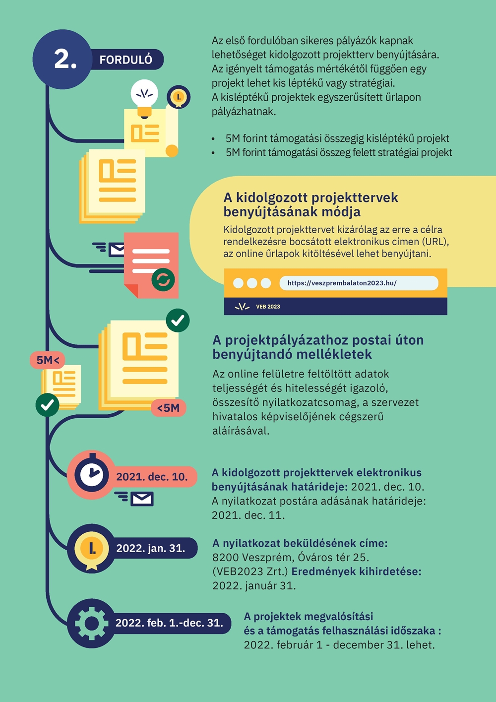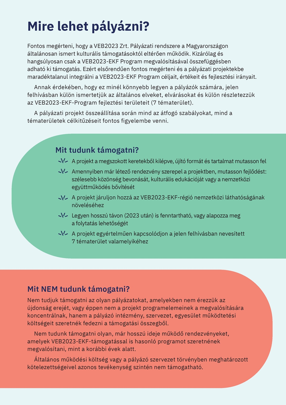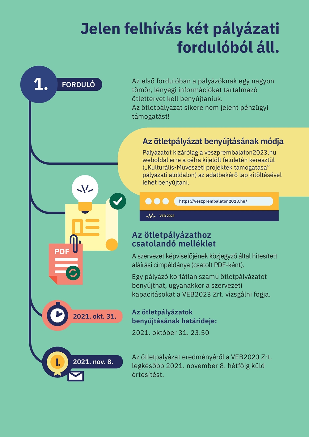 A Veszprém-Balaton 2023 Európa Kulturális Fővárosa Program (VEB2023 EKF) várja azokat az ötletterveket, kreatív kezdeményezéseket, amelyek tovább tudják majd színesíteni a felvezető 2022-es év kulturális kínálatát és ezzel jó alapot adnak a 2023-as programévhez. A felhívás több újdonságot is tartalmaz, amelyek egyrészről gyorsítják és megkönnyítik a programgazdák előkészítő munkáját, másrészről azt segítik, hogy a pályázatok minél jobban kapcsolódjanak a VEB2023 EKF célkitűzéseihez, elveihez.