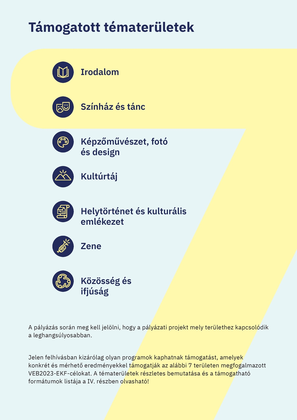 A pályázatokat a VEB2023 EKF 7 fő témájában várjuk: ezek az (1) irodalom, a (2) színház és tánc, a (3) képzőművészet, fotóművészet és design, a (4) zene, a (5) kultúrtáj és Balaton-ökológia, a (6) helytörténet és kulturális emlékezet, valamint a (7) közösség és ifjúság. A hét területhez nagyon konkrét célok és már futó programok tartoznak – ezek bemutatása, pontos leírása megtalálható a VEB2023 EKF hivatalos honlapján: https://veszprembalaton2023.hu/oldal/palyazatok