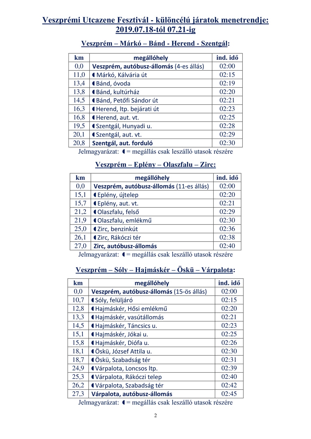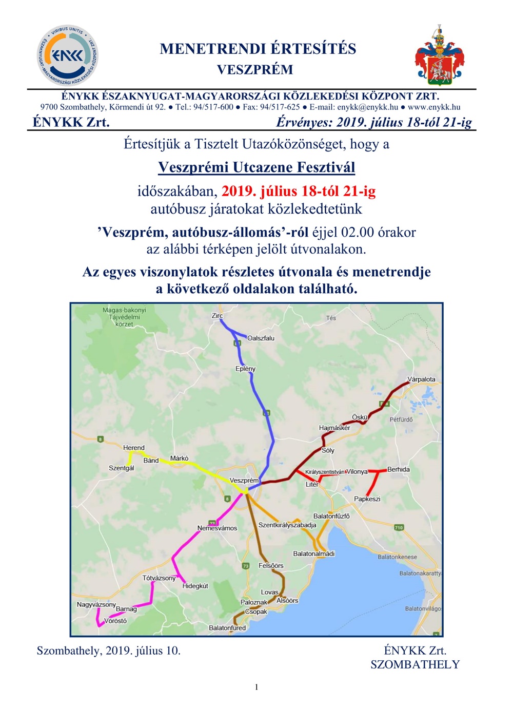 Éjjel 2 órakor Szentgál, Balatonalmádi, Fűzfőgyártelep, Balatonfüred, Várpalota, Nagyvázsony, Zirc és Berhida irányába indít járatokat az ÉNYKK az Utcazene Fesztivál ideje alatt.