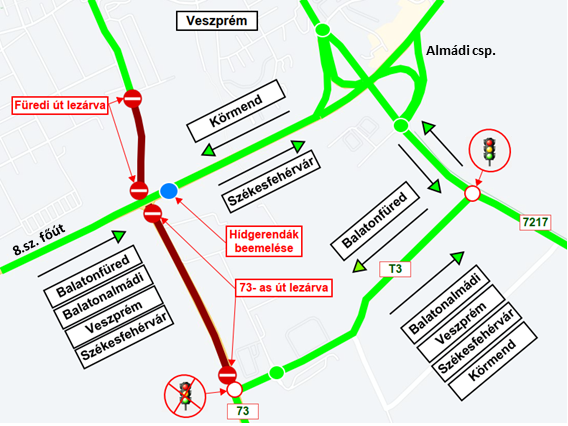 A 8. sz. főút Veszprém déli elkerülőnél 2021. szeptember 16-tól lezárásra kerül a Füredi csomópont, műtárgy- és csomópont építése miatt. Ennek első ütemében hídépítési munkák zajlanak majd, szeptember 17. és szeptember 19. között pedig megtörténik a hídgerendák beemelése.