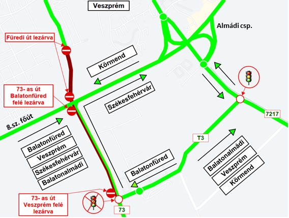 A Füredi csomópontban, a 8. sz. főúton a forgalom továbbra is biztosított lesz a kivitelezés ideje alatt is – 2×1 sávon. A kivitelezési időszakra javasolt útvonal a 73. sz. főút és 7217 j. összekötőút között kialakított T3 terelőút, mely párhuzamosan halad a 8. sz. főúttal. Veszprém városa a már nyáron forgalomba helyezett Almádi csomóponton keresztül közelíthető meg, illetve a városból innen lehet eljutni Balatonfüredre, illetve Balatonalmádiba is.