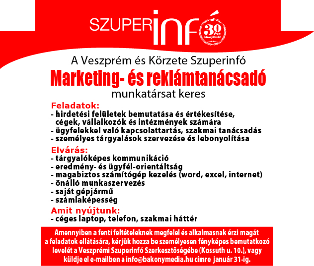 Marketing- és reklámtanácsadót keres a Veszprém és Körzete Szuperinfó.