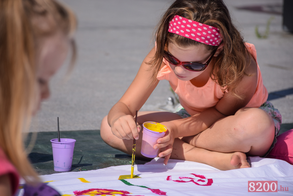 Szülinapi óriás szoknyakifestő mókára hívta a gyermekeket a Gombrich Mester Művészeti Tanodája szombaton délelőtt a Kossuth utcán.