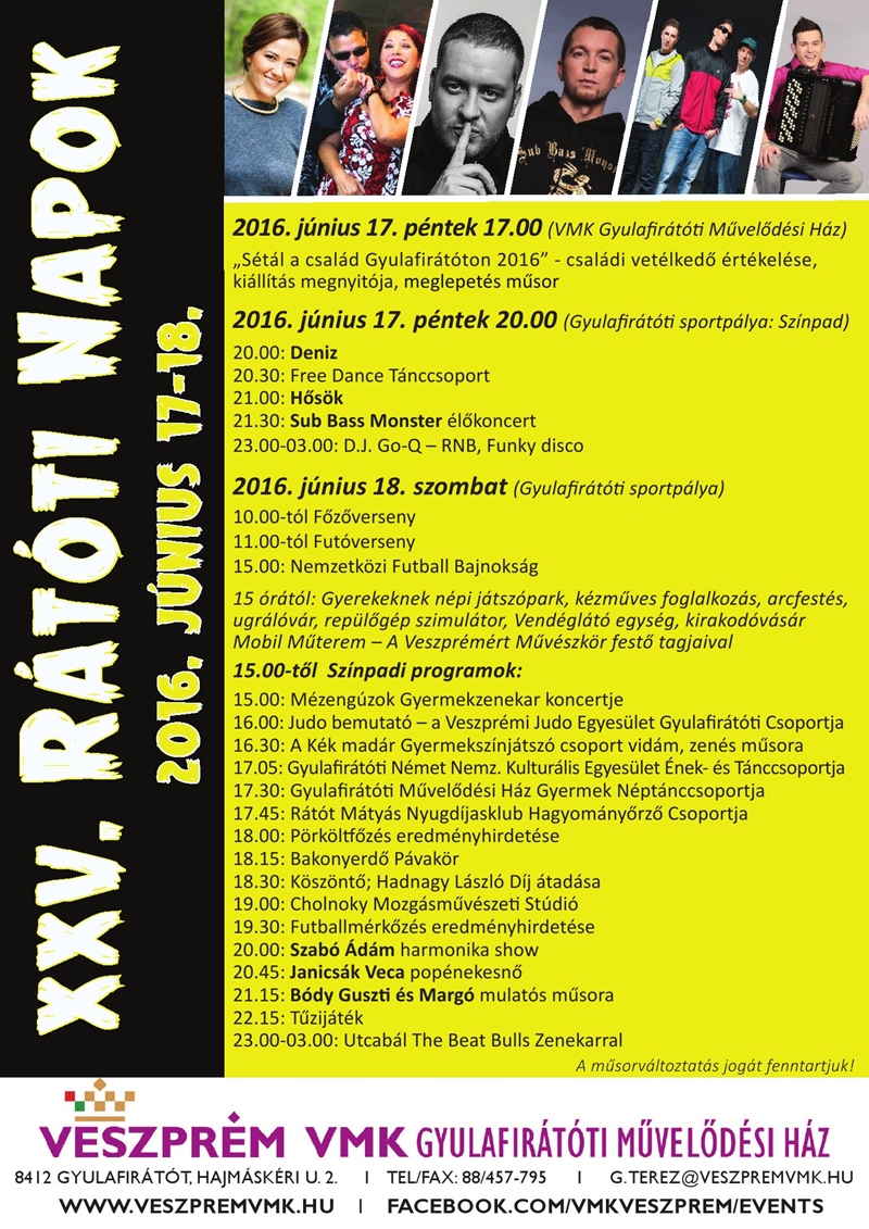 Hősök, Sub Bass Monster élő koncert, Szabó Ádám, Janicsák Veca, valamint Bódy Gusztiék többek között a rátóti napok programkínálatában.