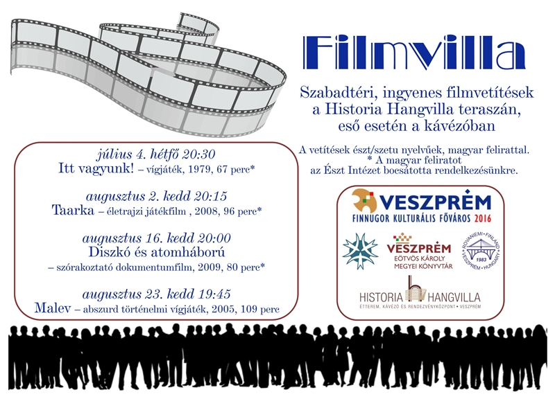 Szabadtéri, ingyenes filmvetítések a Historia Hangvilla teraszán. Eső esetén a kávézóban.