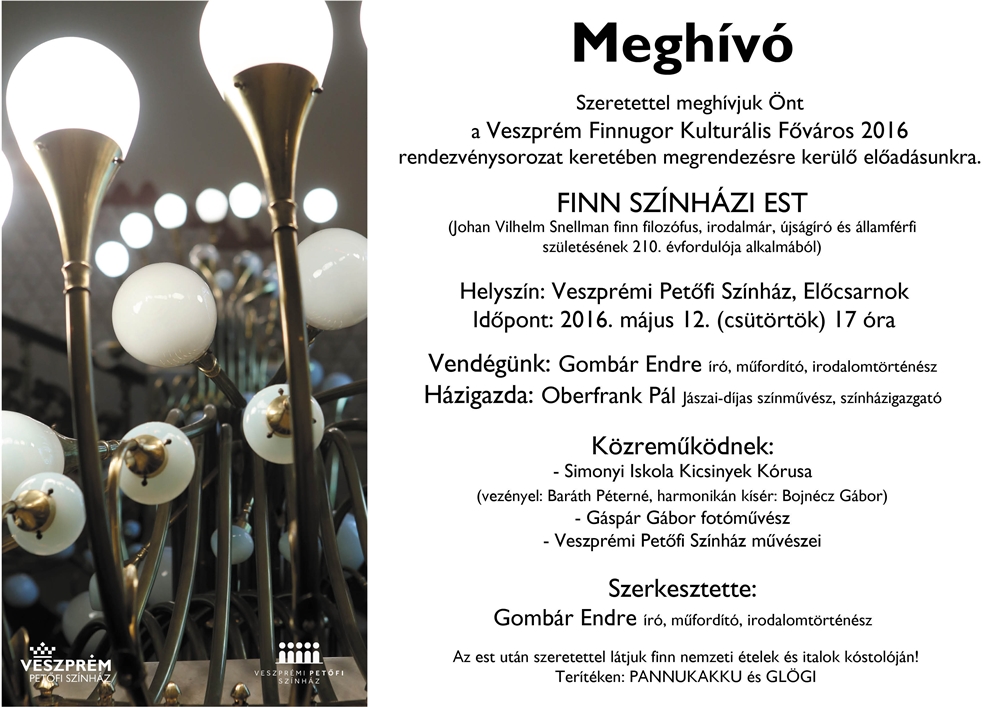 A Veszprém Finnugor Kulturális Főváros 2016 programsorozathoz kapcsolódva finn színházi estet tartanak.