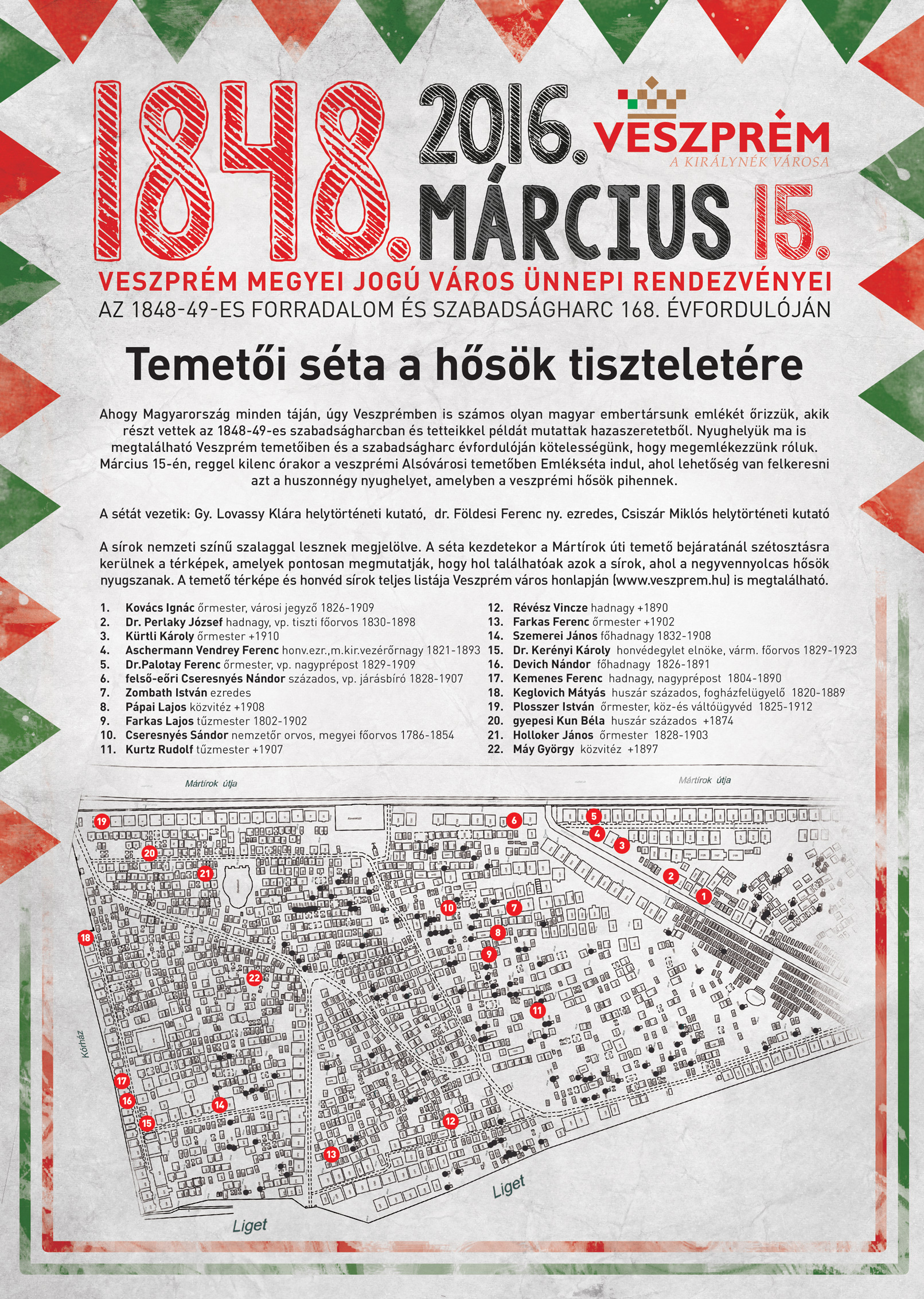 Az Alsóvárosi temetőben indul emlékséta, ahol lelhetőség van felkeresni azt a 24 nyughelyet, amelyben a veszprémi hősök pihennek.