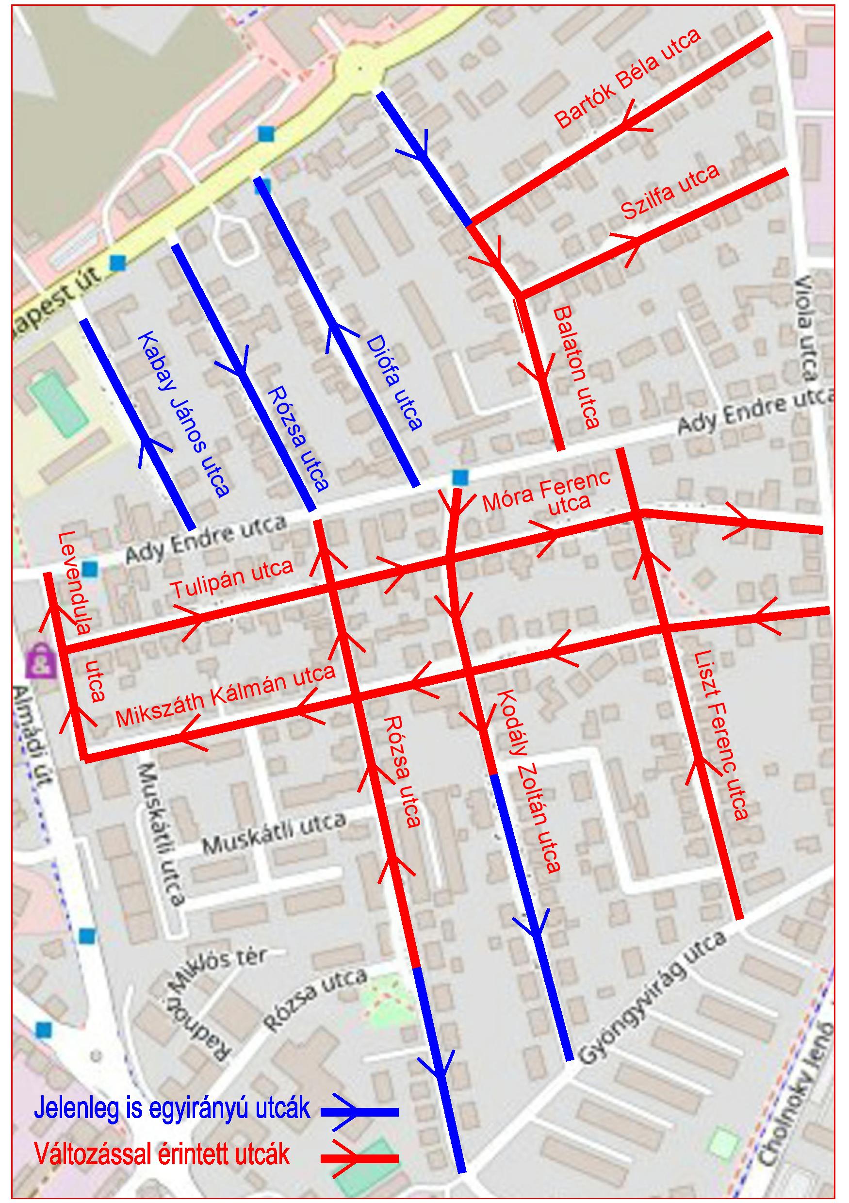 - a Balaton utca egyirányú lesz a Bartók Béla utcától, a Bartók Béla utca felől az Ady Endre utca irányába.