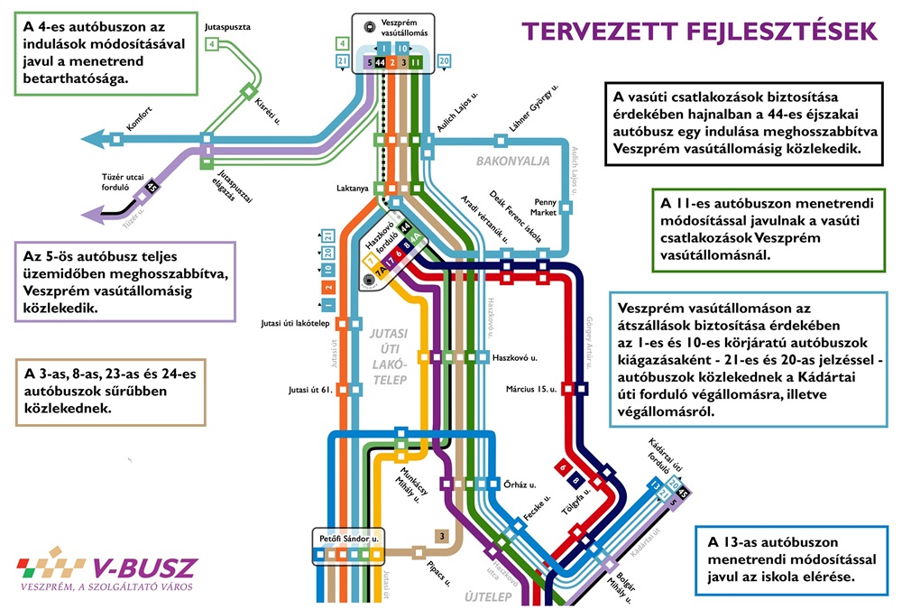 - az 5-ös autóbusz teljes üzemidőben meghosszabbítva, a vasútállomásig közlekedik;