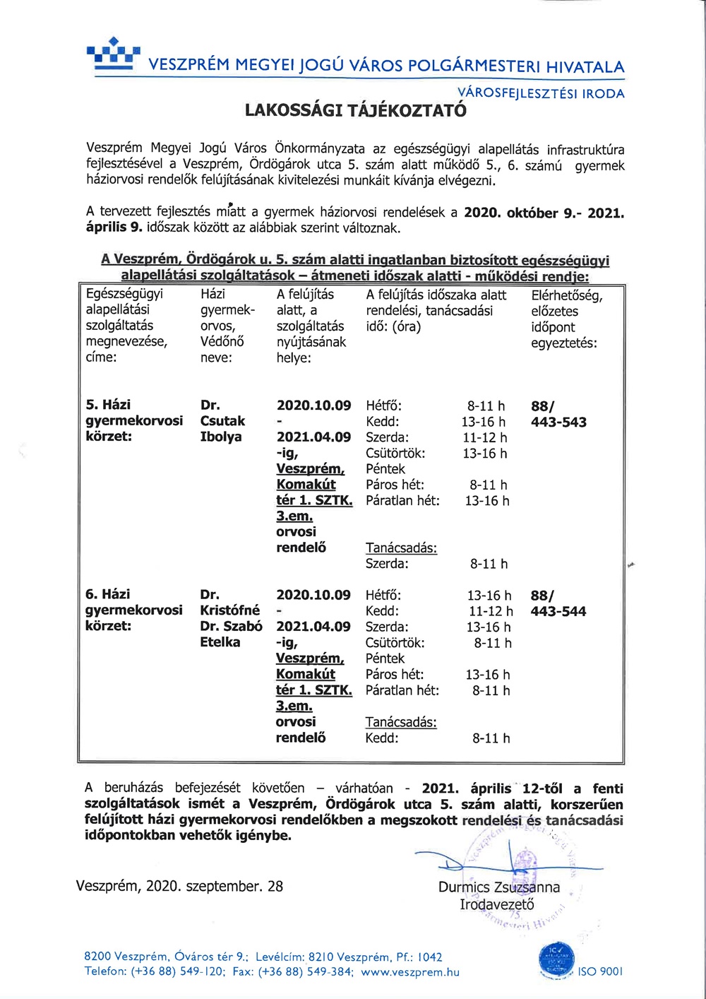 Az Ördögárok utcából az SZTK-ba költöznek ideiglenesen az 5. és 6. gyermekorvosi körzet rendelései.