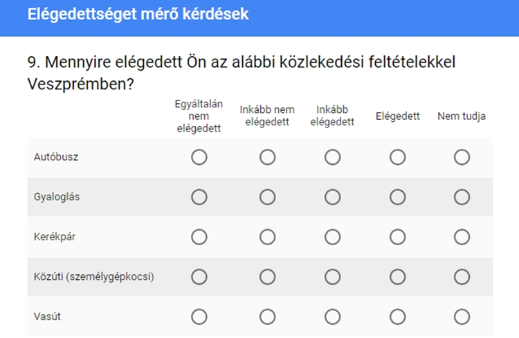Ez a közlekedési szokások felmérése mellett kitér a különböző közlekedési formák elégedettségi vizsgálatára, továbbá megkérdezi a veszprémieket a tervezett fejlődési irányokról, prioritásokról. Ezen felül lehetőséget biztosít egyéni, személyes vélemény kifejtésére is az egyes beruházásokkal kapcsolatban.