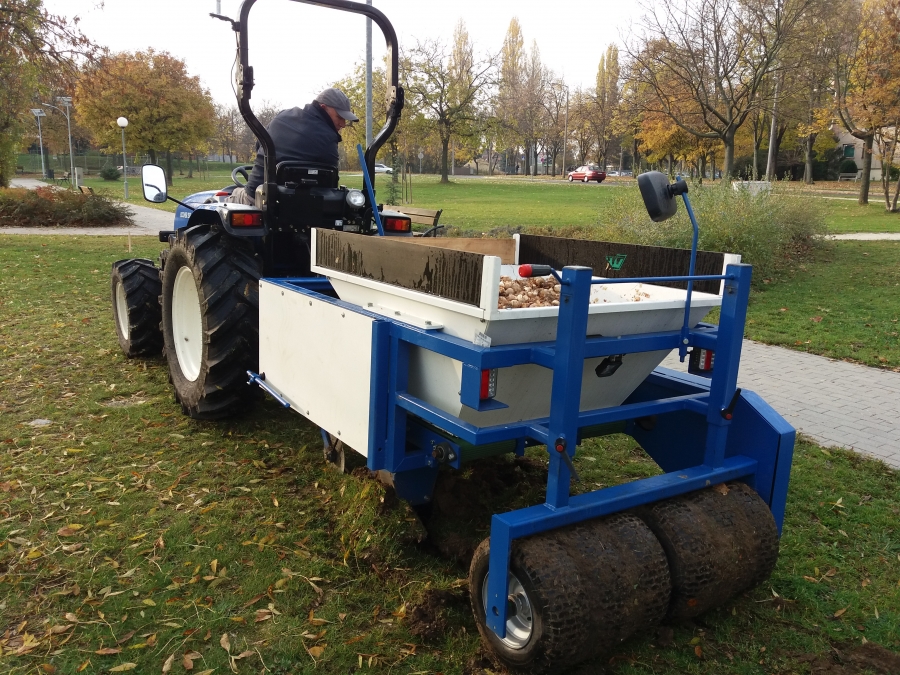 A gép különleges kialakításának köszönhetően a föld felső rétegét szétnyitja, a garatból bezúduló hagymákat elteríti, majd hátsó görgőivel visszahajtja és -lapítja a gyepszőnyeget. Így kerültek a talajba a tavaszi virághagymák a Kálvin parkban, ahol 80 négyzetméteren, krókusz, nárcisz és tulipán virágzik majd, illetve a Budapest út és Jutasi út találkozásánál lévő zöldfelületen, ahol 60 m2 vegyes nárciszcsodákban gyönyörködhetünk majd tavasszal.