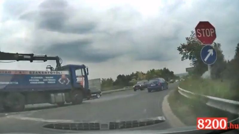 Néhány centin múlott annak az autósnak az élete, aki figyelmen kívül hagyott egy stop táblát Veszprém határában. Videó is készült.